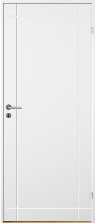Vitmålad kompakt innerdörr med spårfräst dekor.