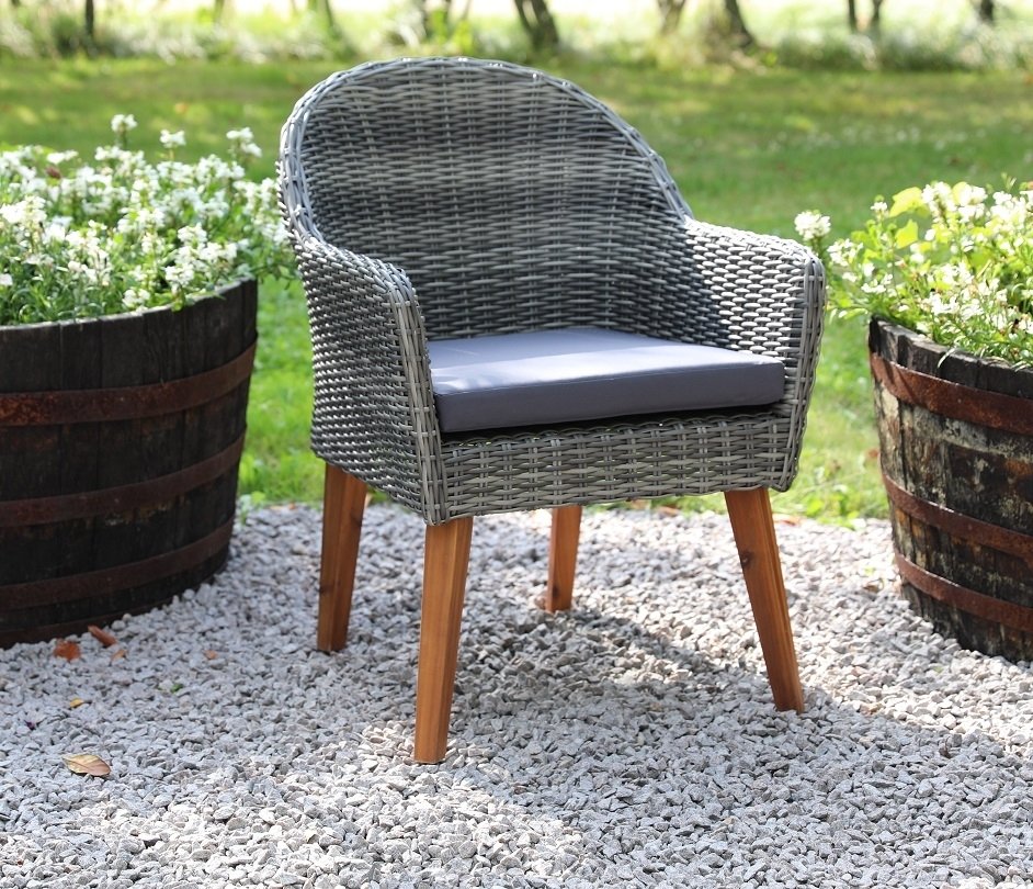 De trädgårdsstolar som medföljer i denna utemöbelgrupp är Valetta och är gjorda i en gråmelerad konstrottning med bruna ben och en mörkgrå sittdyna. I den här utemöbelgruppen medföljer 6 stycken stolar.