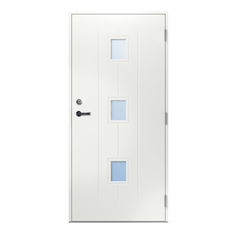 Ytterdörr Borgholm med glas har tre små kvadratiska fönster som ger ett härligt ljusinsläpp och dekorerar dörren fint. Runt fönsterna löper en spårfräst linje som ramar in varje ruta. Vidare har dörren tre horisontella linjer som ger den karaktär och passar till det klassiska och moderna husen.